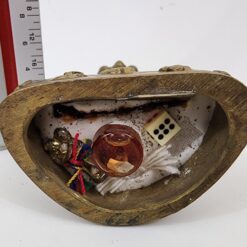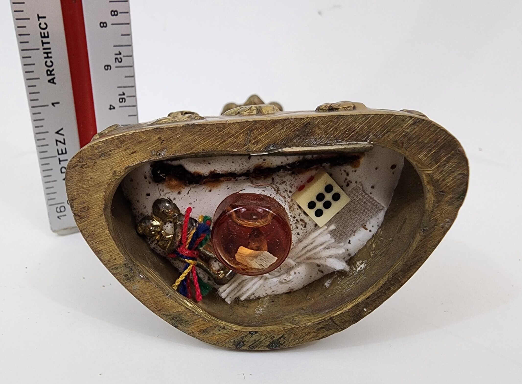 This powerful image stands approximately 5 inches tall, cast entirely in solid bronze, and finished in a soft golden patina. What truly sets this piece apart, however, is its ritual-loaded base, containing sacred powders, wax seals, a small ritual oil vial, bound cord bundles, and talismanic items — all inserted by Ajarn Phrot himself to amplify the statue’s magnetic energy and spiritual potency.